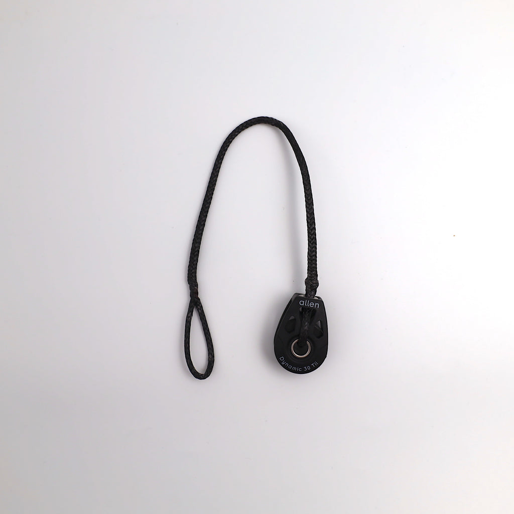 Lätt block med rostfria kullager från Allen, försett med en splitsad stropp i Dyneema för att användas i uthalssystemet på en ILCA/Laser.