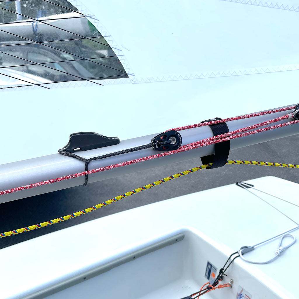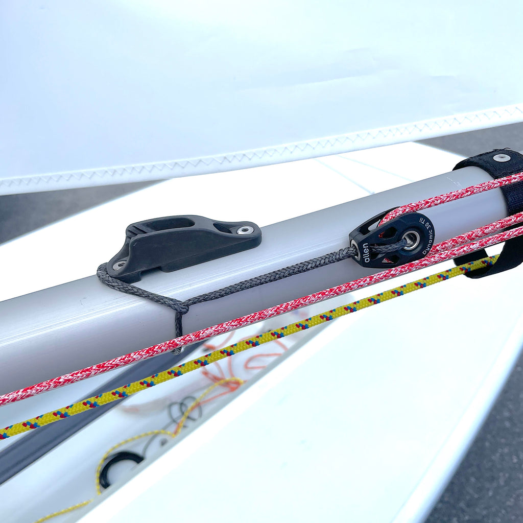 Kullagrat block med splitsad stropp till uthalet ILCA/Laser, för infästning i cleaten på bommen. Utvecklat för högsta funktion och prestanda.